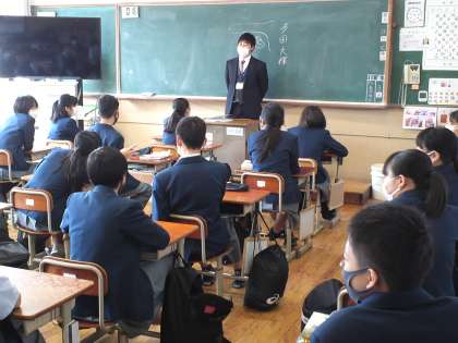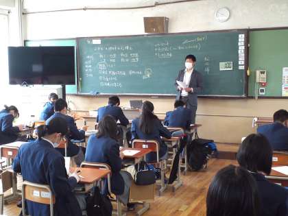 2年3組は、社会の授業で生徒からの質問攻めに遭い、新しく担当になったT先生の自己紹介に終始しました。T先生に対する興味というより… ^^);