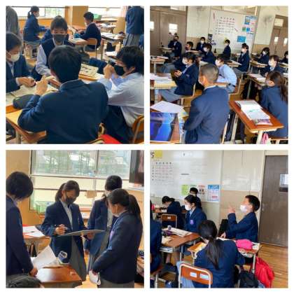 クラスによってはディベートのように,前に出てそれぞれが自分の意見を根拠をもとに話し,それに対して反論や質問をするという形で行われていました。