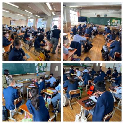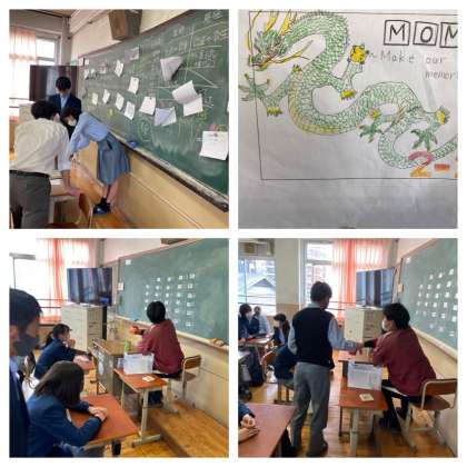 学級旗のデザインをそれぞれもちより,クラスで一つに決めるクラスや,席替えを行うクラス,そして合唱曲を視聴しているクラスとさまざまでした。