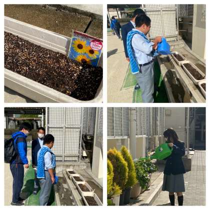先日環境美化委員会で、「ひまわり」の種を植えました。