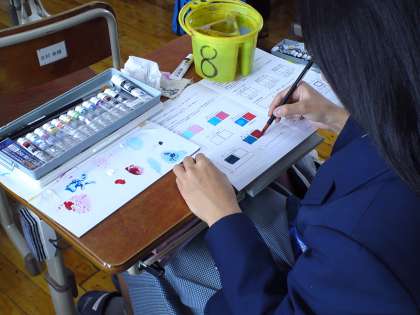 2年4組は、美術の授業で、「色の調子(トーン)」を理解するために、色を混ぜることによって明度や彩度を変化させてみました。
