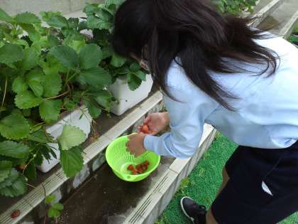 1組は、生活の授業で、栽培している植物の水やりや雑草取りの後、イチゴの収穫をしました。