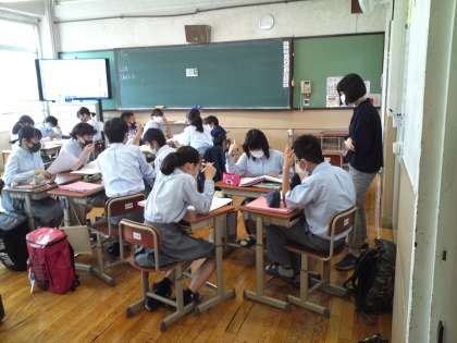 2年2組は、英語の授業で、「旅行計画を立てる」というテーマで班ごとに担当する先生のために立てた模擬の旅行プランを発表する練習をしました。