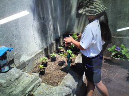 1組は、生活の授業で、種から育てたホウセンカの苗を当校南門の花壇に植え替えました。