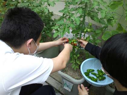 1組は、生活の授業で、栽培しているトマトとピーマンの収穫をしました。