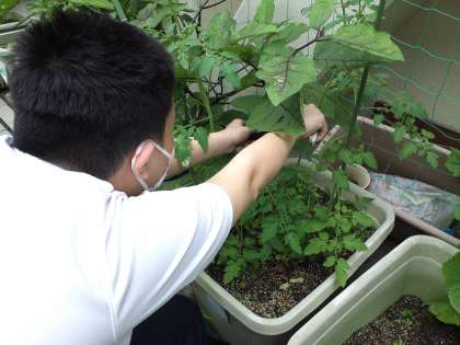 1組は、生活の授業で、栽培している野菜(茄子、ゴーヤ、ピーマンなど)の収穫をしました。