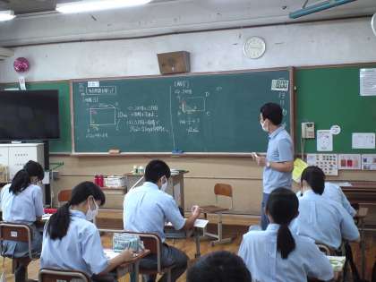 3年2組と4組は、数学の授業で、「動点の問題を解こう」というテーマで、長方形の縦横それぞれの1辺を等速に動く2点と固定された1点によって描かれる直角三角形について、その経過時間と面積の関係を二次方程式にして、問題を解いてみました。