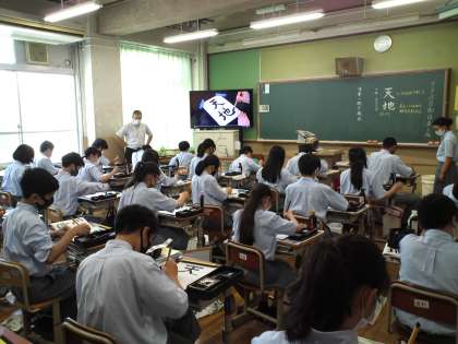 1年2組の国語の授業では、前回、筆ペンを使ったところ、今回は、本格的に筆を使って “天地”という文字を書写しました。