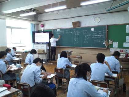 3年2組の数学の授業は、「二乗に比例する関数」の応用として、制動距離に関する問題に取り組み、続いて「振り子の等時性」について学びました。