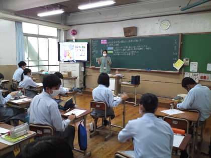 3年2組の技術・家庭科(家庭)の授業は、「幼児の生活習慣の習得を支える家族の役割に気づく」というテーマで、“基本的生活習慣”や“社会的生活習慣”について学び、そして、着替えを嫌がる幼児のビデオを見て、どんな手助けや声掛けをしたらよいかを考えました。