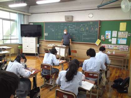 3年3組の理科の授業は、「食物連鎖の“生態ピラミッド”」について学習し、“生態ピラミッド”が崩れる要因として、自然災害のほか、人の手による害(外来種の持込みなど)も考えられることが分かりました。