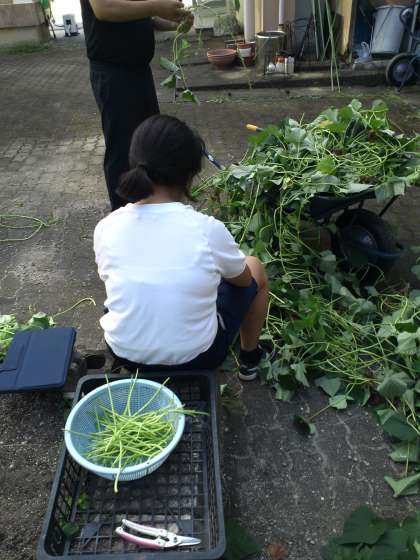 1組は、6月末に植えた“サツマイモ”を収穫する準備として、茎と葉を刈り取りました。