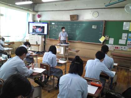 3年2組の理科の授業は、「塩酸の電気分解」について、前回の実験を動画で確認し、陽極と陰極にそれぞれ発生する気体について考えました。