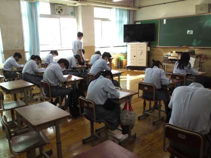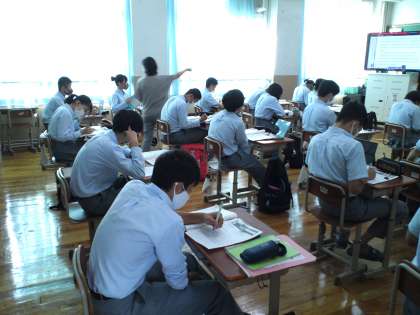 3年3組の数学の授業は、第3回定期テスト問題の数値を変えての類題で再テストがありました。