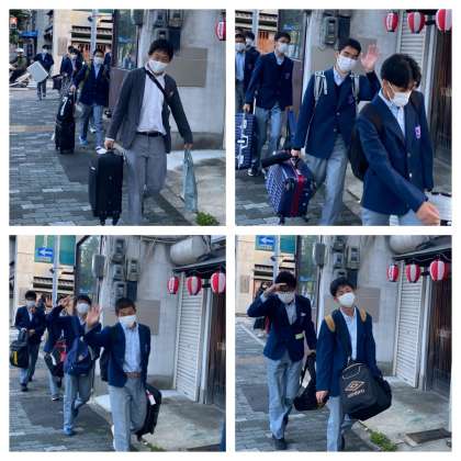 バスへ移動しています。大きな荷物を持っていますが,その表情から笑みがこぼれています。いってらっしゃい!
