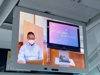 バスレクの様子。高速道路に入りました。自作DVDを鑑賞しています。いろいろな催しが企画されています。