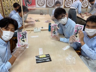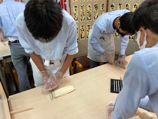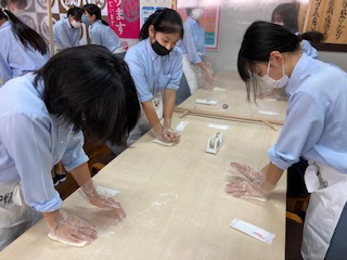 午後から中野うどん学校にて,うどんづくりに挑戦しました。とても元気な講師の先生に,生地のこね方1つから基本を教えて頂き,一人一人が丹精を込めて製作しています。できたうどんは自宅に持ち帰ります。帰宅した時が楽しみですね。