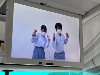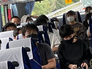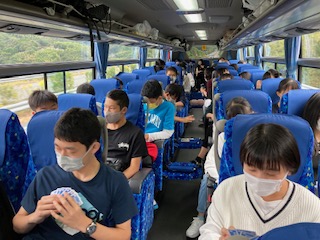 ホテルを出発して,バスは黒潮一番館へ向かっています。そこでかつおのたたき体験をします。バスの中ではバスレクとしてイントロクイズをしています。
