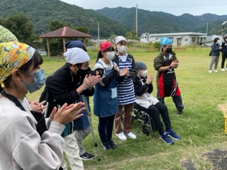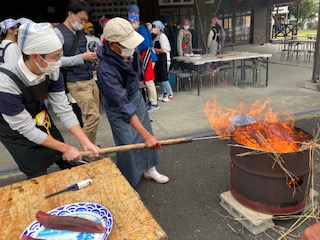 次は藁焼きです。藁に火をつけ燃え上がった炎で,カツオを炙ります。もともと生で食べられるものですので,皮からサッと炙ります。ここでも拍手喝采!