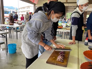 興味深そうに生き生きとした体験を一人一人できています。包丁さばきもみんななかなかの腕前でした。