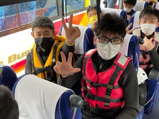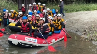 ラフティング組はバスで上流へ向かい,元気に出発していきました! チームごとに独特の掛け声で,気持ちをひとつに漕ぎ進めていきます!