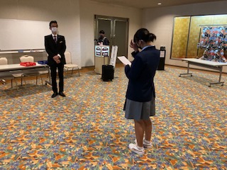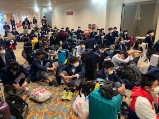 退館式の様子。代表生徒がホテルの従業員さんに挨拶をしています。素敵なホテルで快適に過ごし,思い出もしっかり心に刻めたようですね。名残を惜しみつつ,「瀬戸大橋記念公園」に向けて出発しました。