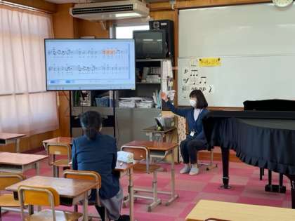 1組の音楽の授業は、「“夏の思い出”と“サンタルチア”の楽曲解釈など」を学んだ後、歌唱練習をしました。