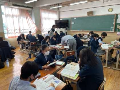 2年3組の理科の授業は、「生物の体のつくりとはたらき」の学習を終えて振り返りを記入し、練習問題を解きました。そして班員同士で質問し合いながら理解を深めました。