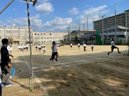 1年2組の体育の授業は、「走り幅跳び」の練習をした後、計測をしました。