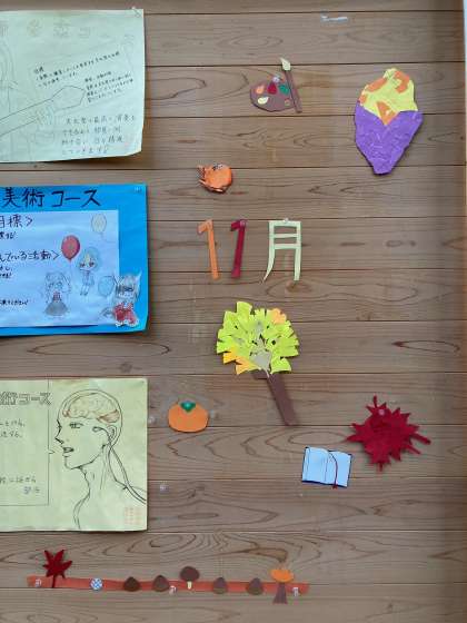美術コースの掲示板飾りが、11月バージョンになりました。
