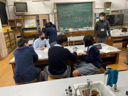 3年2組の理科の授業は、「金属のイオン化傾向」について復習した後、続いて塩酸と数種類の金属の中から2つの金属を組み合わせた電池を作る実験をしました。