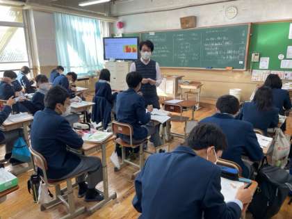 3年2組の数学の授業は、「相似な立体の体積比・面積比を考えよう」というテーマで、まず、相似な立体の要件を学び、その後、体積比と面積比がどうなるかを考えました。