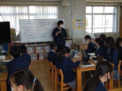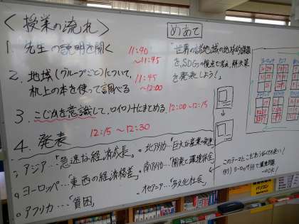 11月15日(月)学校図書館を活用した授業(1年生社会科)です。これは地理的分野のまとめとして「世界の諸地域の地球的課題をSDGsの視点で考え,解決策を発表しよう」をねらいとした学習です。