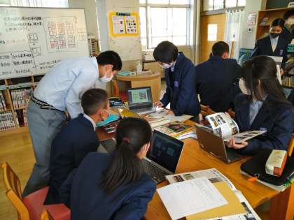 1時間で発表まで行うというかなり欲張った内容でしたが,アジア・オセアニアなど各グループに分かれて実施しましたが,見事にやり切ることができました。クラス全員が一人残らず学習に参加し,主体的に学ぶ姿は図書館ならではの学習風景であり,図書館を活用したことで,今までの教室の学習がさらに深化したものになりました。終了後,生徒に感想を聞くと「教室と違って,図書館の授業は50分が短く感じる」「先生の話が短いし,自分で調べて自分の考えを発表するのは面白い」などのコメントが返ってきました。