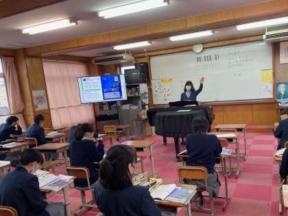 2年2組の音楽の授業は、「土井晩翠作詞、瀧廉太郎作曲“荒城の月”」について、原曲と山田耕筰編曲を聴き比べながら、歌詞が生み出す情景と雰囲気を味わいました。