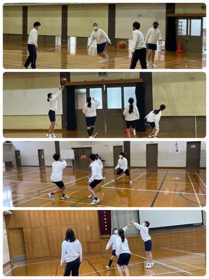 3年3組の体育の授業では、ハーフコートを使って2on2でバスケットボールの練習をしました。