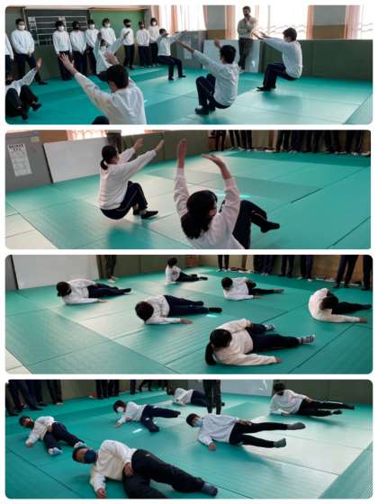 2年2組の体育の授業では、柔道の「後ろ受け身」と「横受け身」の練習をしました。