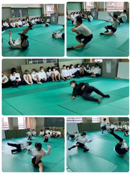 1年2組の体育の授業では、柔道の「後ろ受け身」のテストを受けた後、「横受け身」の練習をしました。