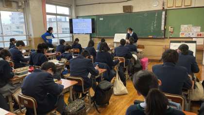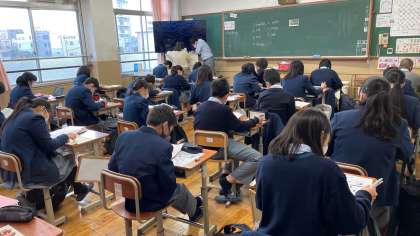 2年2組の国語の授業では、「太宰治作“走れメロス”」について、「王が三日間の猶予を与えたのはなぜか」など、班別に一つずつ“七つの謎”が割り与えられ、想像を加えることなく、作品中の実際の記述や作者の生き方を根拠として謎を解き、発表しました。