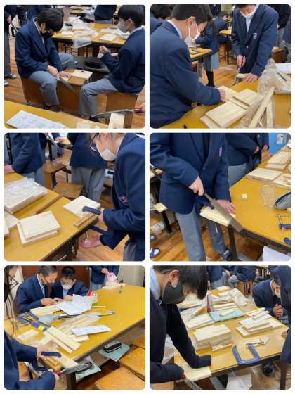 1年2組の技術家庭科(技術)の授業では、木材を使った作品づくりに取り掛かりました。