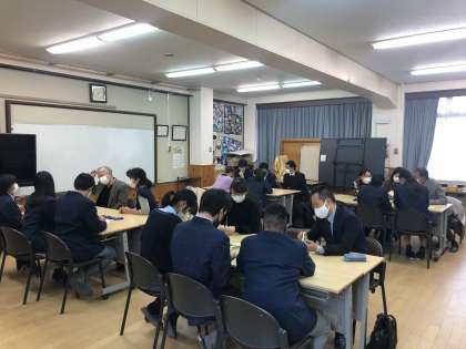 本日,12月24日(金)13:30より,ふれあいルームにてにおいて,嘉楽ふれあいコアトークが行われました。これは嘉楽地生連の取組で,本校の生徒会本部役員と,地生連の役員や本校のPTA役員の方々も含め地域の大人の人とが,人権標語が印刷された用紙でリーフレットを作りながら語り合うというものです。