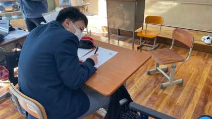 1組の授業は、2年生が、4月に入学予定の1組の生徒に対する紹介スライド作成のための資料作り、3年生が数学のテストを受けました。