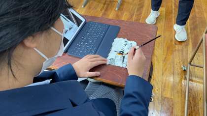 1組の生活の授業では、紙すきの紙を利用したメッセージカード作りで、昨日描いた下絵に着色をしました。