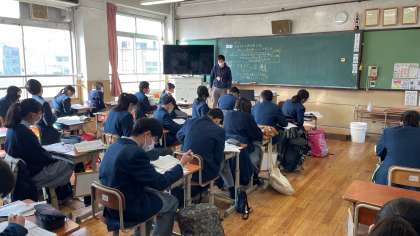 2年4組の理科の授業では、「雲のできるメカニズム」について、フラスコと注射器を使って体積を増加させてフラスコ内の圧力を下げることによって、雲を疑似的に発生させる実験動画を見て、学びました。