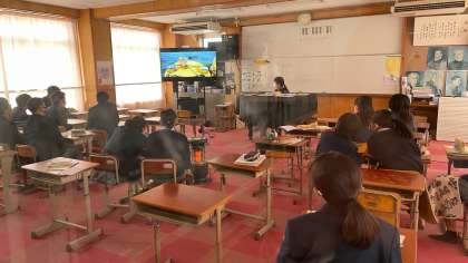 2年2組の音楽の授業では、「映画音楽の味わいを知ろう」というテーマで、アメリカ映画「ジョーズ」の一部を鑑賞しました。