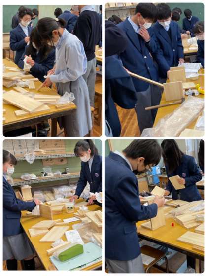 1年2組の技術・家庭科(技術科)の授業では、木材を使った作品(本立てなど)創りをしました。