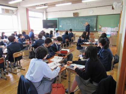2年3組の社会の授業では、「山地や山脈から日本の自然環境の特色を考えよう」というテーマで,世界的に見て日本は山が多いことから,それを生かした産業や生活について考えました。