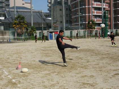 ラグビー部は,顧問の先生がキックしたボールをキャッチしてパスにつなげる練習をしていました。