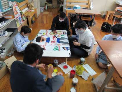 1組の生活の授業では、完成した学級旗について,一人の生徒がもう少し,「修正や手を加えたい」という申し出があり,クラス員全員で取り組むことにしました。みんなの絆の強さがうかがえますね。