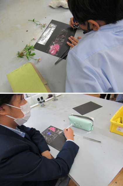 1組の理科の授業では、「花の標本を作ろう」というテーマで,校内にある植物(ツツジ,ドクダミ,ハルジオン,ツユクサなど)を一人ひとり採取し,標本にしました。